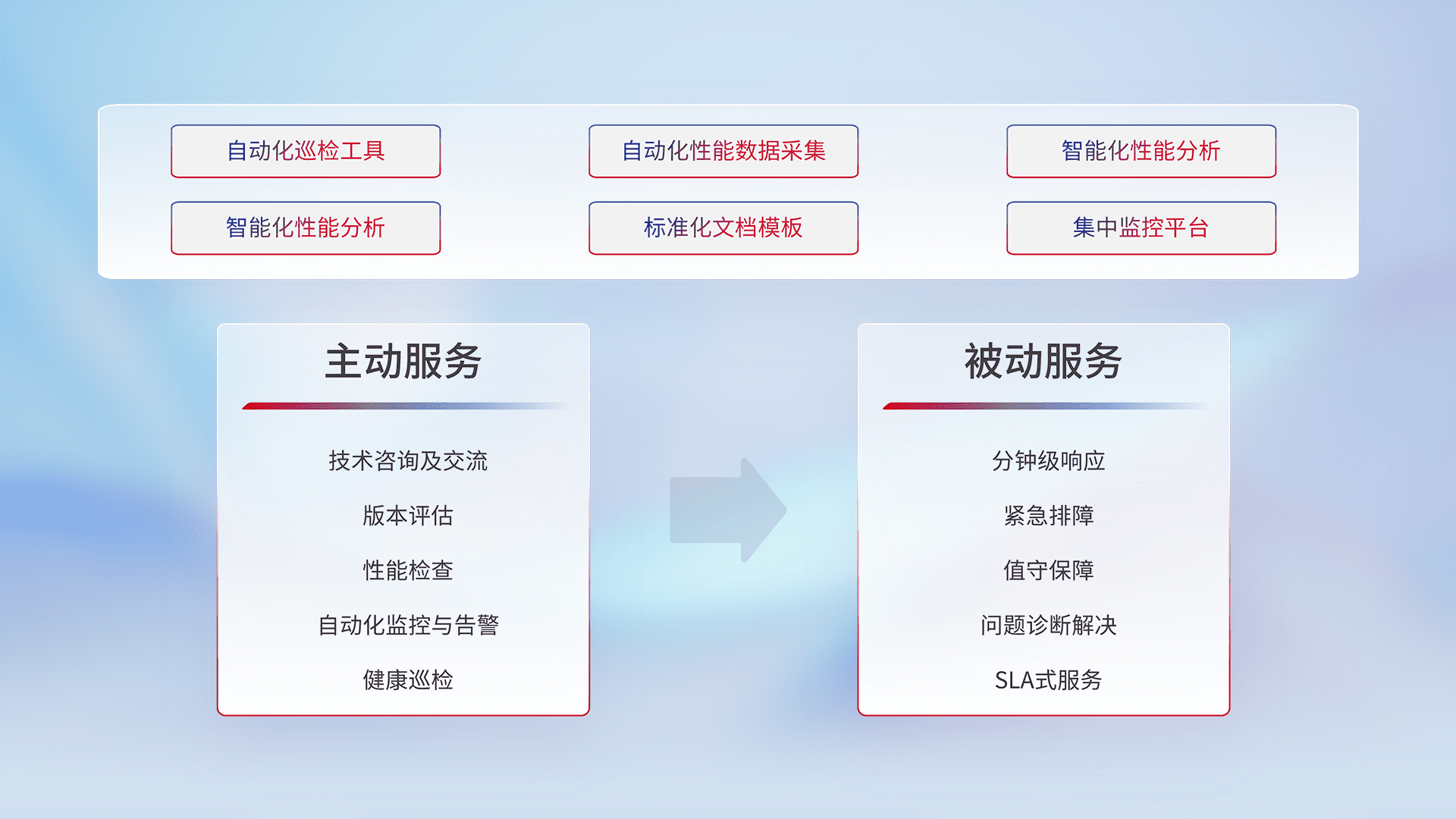 智能化工具和标准化文档,,,保障服务质量,,,,提供主动服务(包含技术咨询、、版本评估、、、、性能检查、、、、自动化监控与告警、、、健康巡检)和被动服务包含(分钟级响应、、、、紧急排障、、、值守保障、、、问题诊断解决、、SLA服务)。。