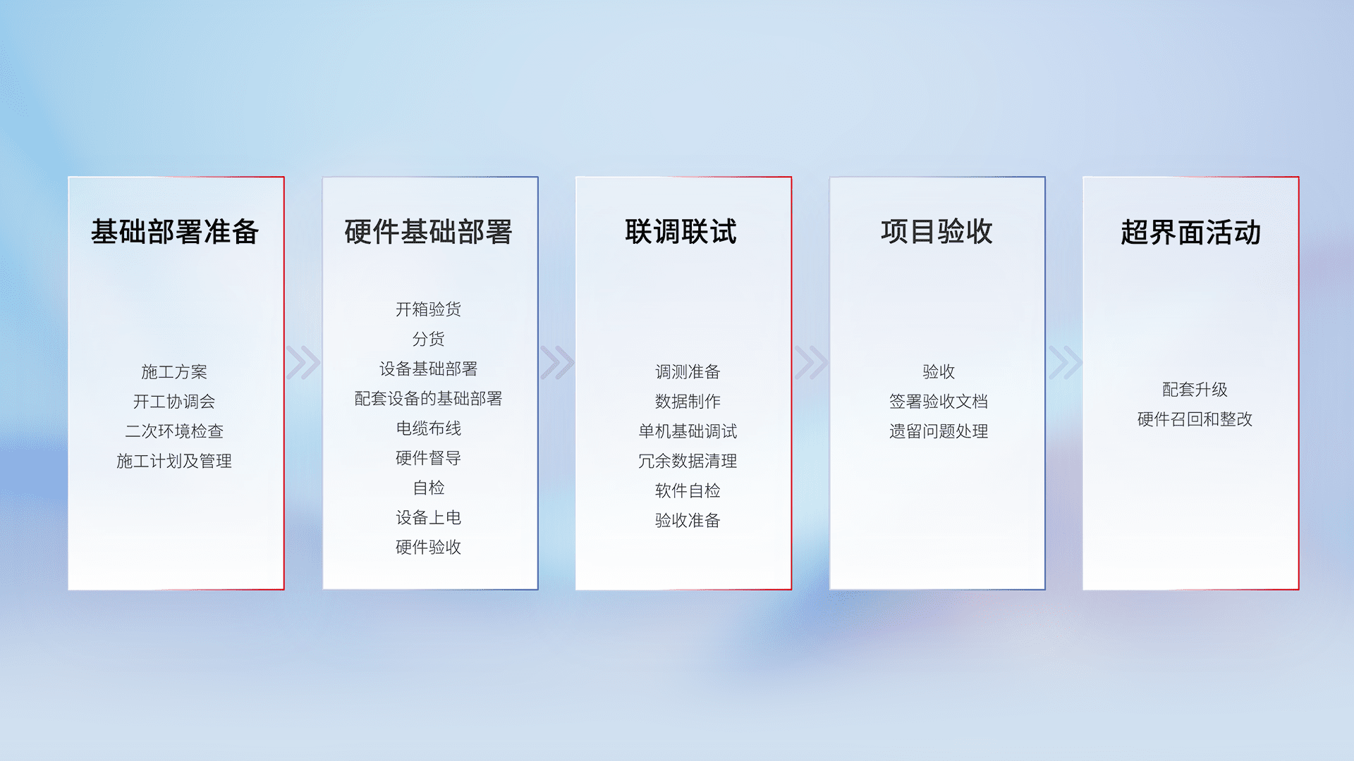 从基础部署准备、、、硬件基础部署、、联调联试、、项目验收、、越界面活动的全过程可追溯,,保证施工质量和进度。。。。